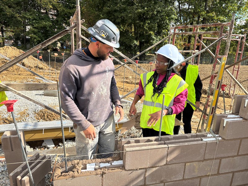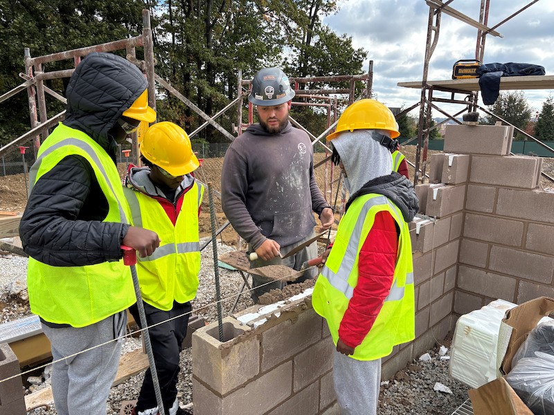 BAC 23 Bricklayer Jacob Addis showing John R. Buchtel CLC students how to lay block