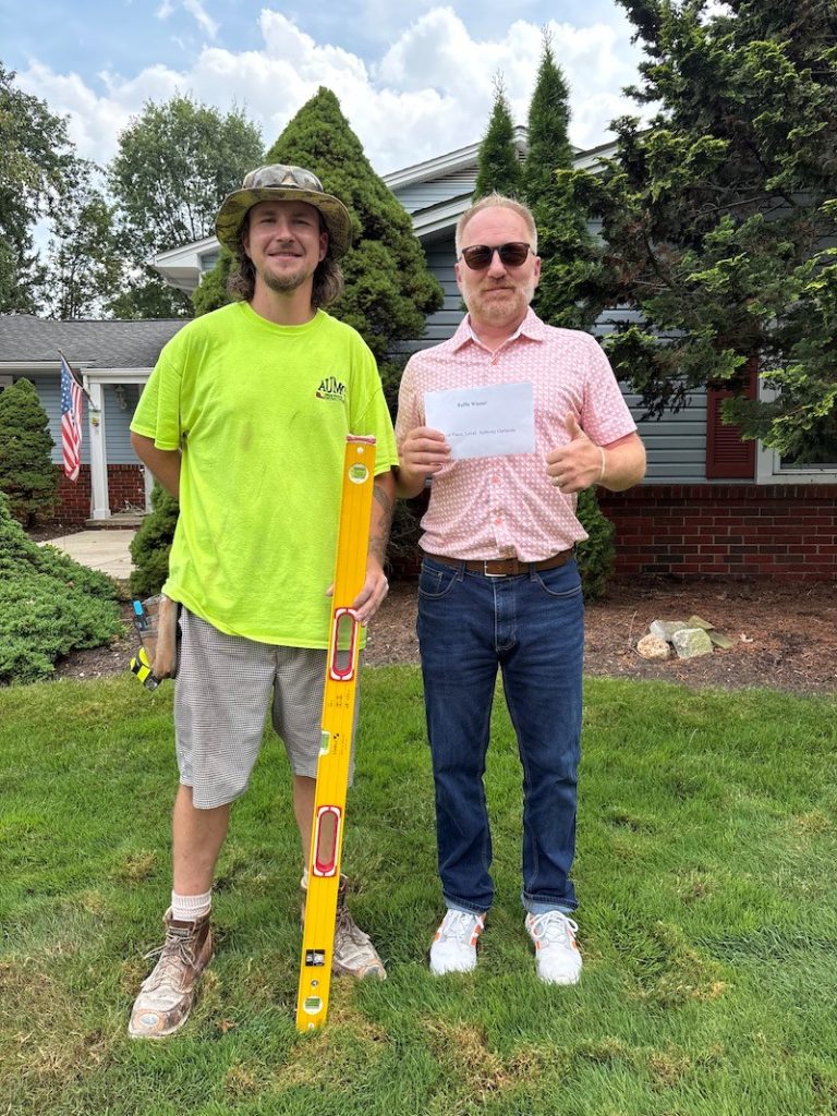 Raffle winner Anthony Garlando with his level presented by Northshore Field Representative Mike Soltis.